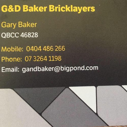 G&D Baker Bricklayers Rating (average) (0) Listing Category Bricklayers Website View Our Website Phone 61 404 486 266 Email gandbaker@bigpond.com ZIP Code 4035 Address Albany Creek QLD 4035 Ratings There are no reviews yet. Please login to leave a review. Contact listing ownerSend Message Name Email Phone Number Message